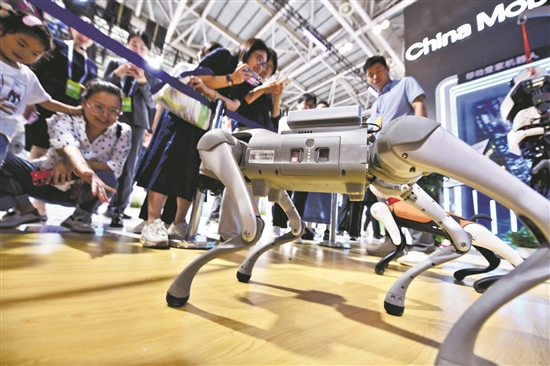 5月23日,福建省福州海峽國際會展中心,第七屆數(shù)字中國建設(shè)峰會現(xiàn)場體驗區(qū)的參觀者與機器狗互動。據(jù)了解,今年整體現(xiàn)場互動體驗項目超過100個,其中包括超大尺寸8K超高清裸眼3D大屏、人形機器人等等。 王東明 攝