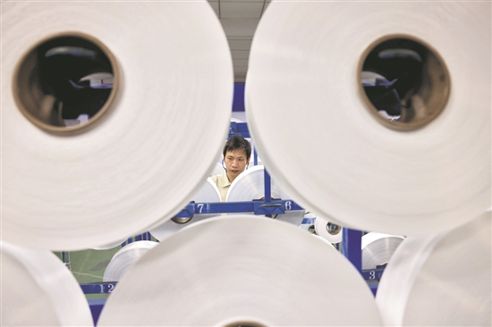 5月22日,福建省福州市連江縣的福建恒捷實業(yè)有限公司,工人在生產(chǎn)線上趕制紡織化纖訂單。本報通訊員 王旺旺 攝