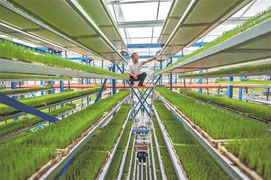 5月22日,安徽省蕪湖市繁昌區(qū)平鋪鎮(zhèn)宏慶數(shù)字育秧中心,工作人員在循環(huán)式育秧機上查看水稻秧苗生長情況。本報通訊員 肖本祥 攝