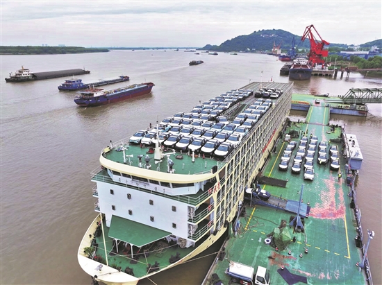 5月2日,安徽港口集團蕪湖港朱家橋港區(qū),一艘滾裝貨輪正在裝載發(fā)往全球市場的奇瑞集團各品牌汽車。(無人機照片)