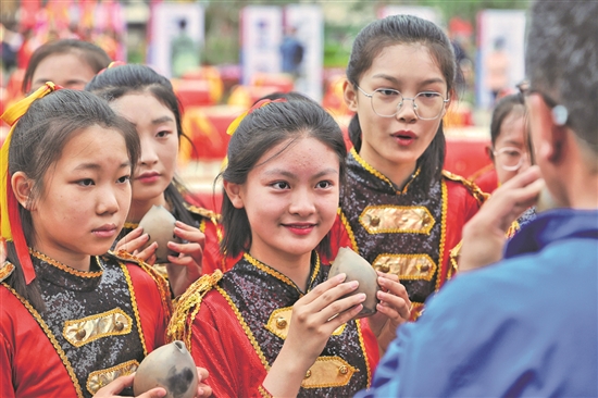 5月22日,日照市東港區(qū)海曲印象文化廣場,中學(xué)生在觀看民俗文化展演。