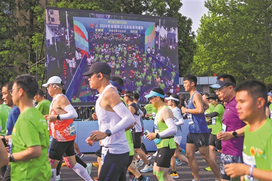 5月19日,日照,以“中國夢·勞動美——跑向美好生活”為主題的2024年全國職工馬拉松系列賽事(日照半程馬拉松站)熱力開跑。圖為參賽者在比賽中。