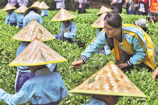 5月23日,日照天臺山旅游區(qū)的茶園里,幼兒園小朋友在老師指導(dǎo)下體驗采茶。
