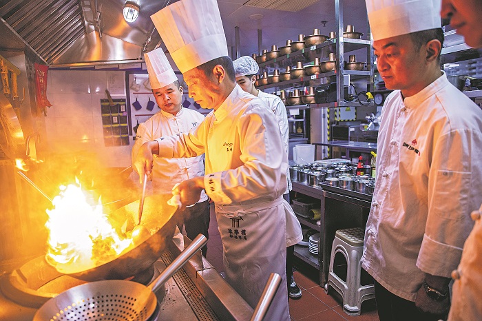圖為5月22日,北京萃華樓餐飲集團,王培欣(左二)正在為廚師講解招牌菜的制作過程。