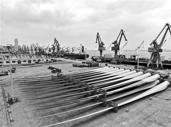 5月25日,在江蘇連云港港東方港務(wù)分公司碼頭,大批風(fēng)電設(shè)備集港準(zhǔn)備裝船出口國(guó)外。今年,江蘇連云港港積極打造海上絲路出??冢_(kāi)辟風(fēng)電設(shè)備出口綠色通道,助力“中國(guó)制造”風(fēng)電設(shè)備走向世界。近年來(lái),連云港不斷開(kāi)發(fā)清潔能源,大力發(fā)展風(fēng)電設(shè)備制造產(chǎn)業(yè),形成了從葉片、塔筒、電機(jī)控制系統(tǒng)到機(jī)組的風(fēng)電裝備研發(fā)和制造產(chǎn)業(yè)鏈,一批又一批風(fēng)電設(shè)備從口岸裝船出口到海外。