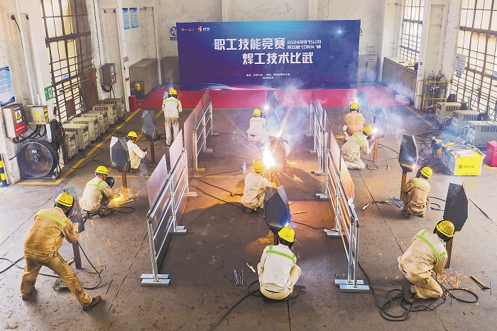 5月24日,浙江寧波舟山港股份有限公司北侖礦石碼頭分公司舉行職工技能大賽焊工技術(shù)比武活動,12名焊接能手齊聚一堂,通過平焊、立焊、橫焊、仰焊等精湛的手工電弧焊技藝,在規(guī)定的時(shí)間內(nèi)焊接出公司工會的品牌LOGO,實(shí)現(xiàn)工匠精神與企業(yè)文化的雙重展示。圖為機(jī)修分部修理三班的選手們在比拼焊接技藝。蔣曉東 攝
