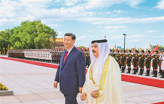 5月31日下午,國(guó)家主席習(xí)近平在北京人民大會(huì)堂同來(lái)華國(guó)事訪問(wèn)并出席中阿合作論壇第十屆部長(zhǎng)級(jí)會(huì)議開(kāi)幕式的巴林國(guó)王哈馬德舉行會(huì)談。這是會(huì)談前,習(xí)近平在人民大會(huì)堂東門(mén)外廣場(chǎng)為哈馬德舉行歡迎儀式。