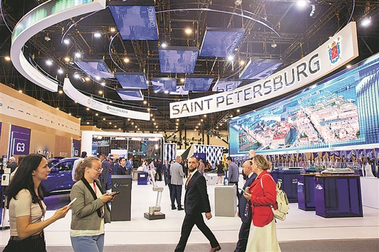 當(dāng)?shù)貢r(shí)間6月5日,人們?cè)诙砹_斯圣彼得堡國際經(jīng)濟(jì)論壇的展廳內(nèi)參觀。