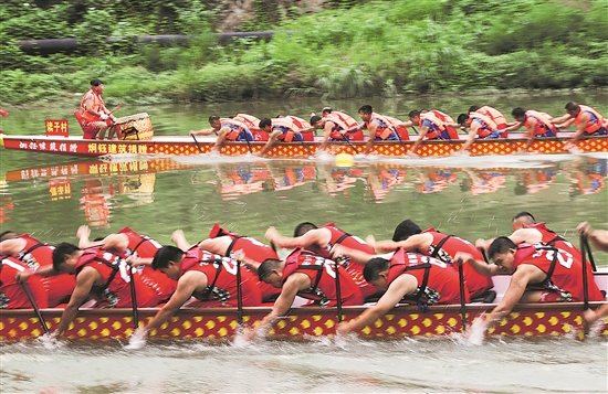6月5日,湖南省漣源市橋頭河鎮(zhèn)龍舟賽上,選手們揮槳競(jìng)渡。