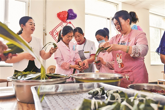 6月5日,甘肅省臨澤縣中心敬老院開(kāi)展“粽情端午幸福敬老”主題活動(dòng),工作人員為老人們包粽子。本報(bào)通訊員 安學(xué)海 攝