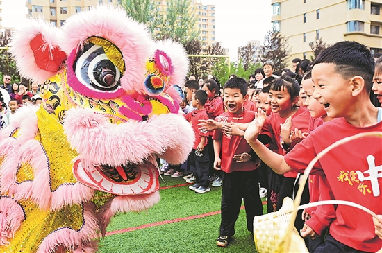 6月5日,內(nèi)蒙古鄂爾多斯,康巴什區(qū)第十二幼兒園孩子觀看舞獅表演。