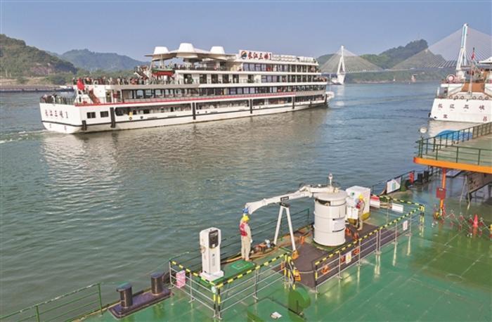 圖為純電動(dòng)旅游船“長(zhǎng)江三峽1”號(hào)駛離后,國(guó)網(wǎng)宜昌供電公司岸電運(yùn)維人員對(duì)岸電設(shè)備進(jìn)行巡檢。