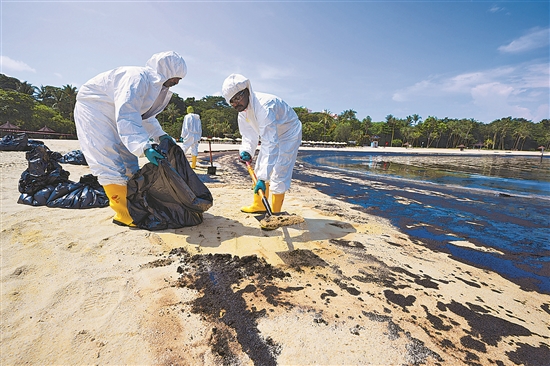 一艘挖泥船6月14日與一艘加油船在新加坡巴西班讓碼頭發(fā)生碰撞,受損加油船的部分油料泄漏到海水中,導(dǎo)致圣淘沙島和新加坡東海岸多個(gè)海灘受到污染。目前,出現(xiàn)油污的海灘已被關(guān)閉,以便進(jìn)行清理工作。新華社發(fā) (鄧智煒 攝)