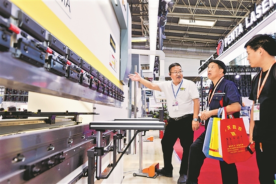 6月17日,在中國國際展覽中心(順義館),參展商向參觀者介紹一款自主研發(fā)生產(chǎn)的折彎設(shè)備。