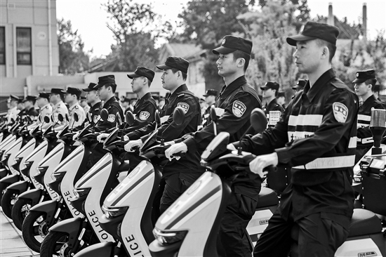 6月13日,北京市公安局東城分局舉行了分局機動巡邏隊成立暨警用電動車發(fā)放儀式。新成立的機動巡邏隊每期由5名青年民警和40名戰(zhàn)訓保安員組成,開展巡邏防控、人流疏導、亂象清整、快速處置等工作。本報記者 蔚可任 攝