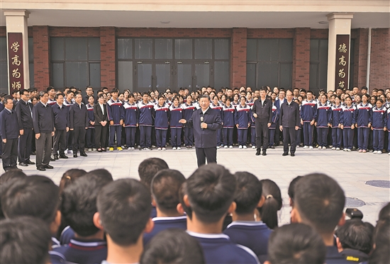 教學(xué)樓前廣場(chǎng)上,師生們紛紛圍攏過(guò)來(lái),高聲向總書(shū)記問(wèn)好。習(xí)近平親切地對(duì)大家說(shuō),我到西寧第一站就來(lái)看望老師和同學(xué)們。上海援建的這所中學(xué),培養(yǎng)來(lái)自果洛牧區(qū)的各民族孩子,成效明顯,意義深遠(yuǎn)。希望孩子們倍加珍惜這里的良好條件,心懷感恩、好好學(xué)習(xí),德智體美勞全面發(fā)展,立志成為中國(guó)特色社會(huì)主義事業(yè)的接班人和建設(shè)者,努力為自己贏得人生出彩的機(jī)會(huì)。他祝孩子們學(xué)有所成、健康成長(zhǎng)。