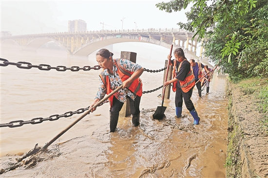 6月19日,在廣西柳州市融安縣,工作人員在融江邊清理淤泥。