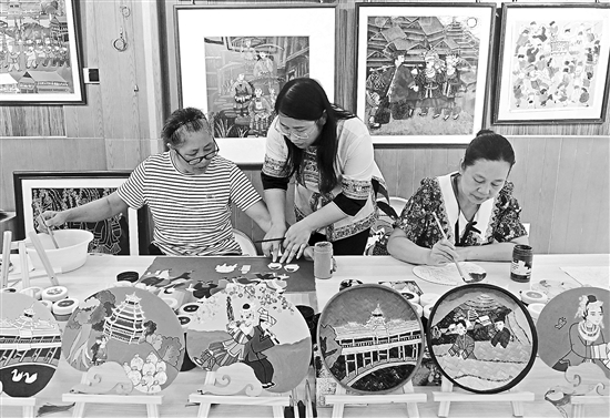 6月19日,在廣西三江侗族自治縣侗畫館,侗族農(nóng)民畫作者在創(chuàng)作。