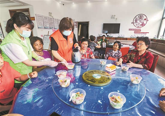 6月20日,在浙江省湖州市吳興區(qū)龍泉街道老年食堂內(nèi),志愿者在給老人們準(zhǔn)備當(dāng)?shù)靥厣南钍澄铩岸鄻訙?。“多樣湯”是湖州夏季傳統(tǒng)美食,由蜜棗、金桔、紅絲綠絲、冬瓜糖、薄荷水等制作而成。