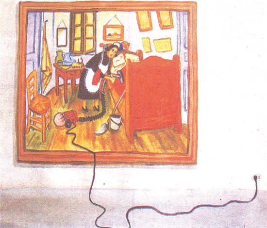 國(guó)外油畫《理家》描繪女主人專心致志地清掃房間,為了讓家具一塵不染,漫畫家竟將吸塵器的使用“穿越”到百余年前。