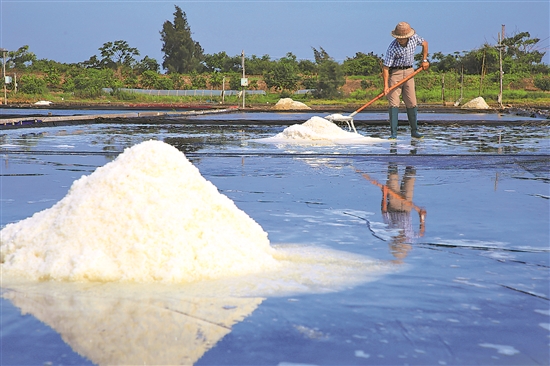 6月22日,在浙江省溫州市樂(lè)清灣畔的南塘?xí)覃}場(chǎng),工人在曬鹽。時(shí)下正是曬鹽的黃金季節(jié),在南塘?xí)覃}場(chǎng),工人在鹽田辛勤勞作,一派忙碌景象。