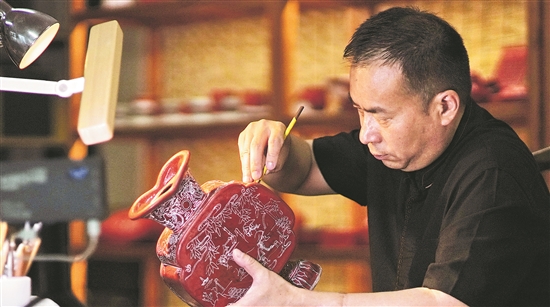 近日,朱江在工作室為髹漆后的胎體繪制線稿。
