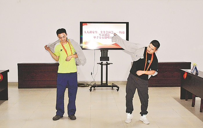 6月21日,中煤新集設(shè)備維修公司職工活動(dòng)中心多功能會(huì)議室里,一場(chǎng)特殊的比賽正在展開。這里沒有加油吶喊,沒有速度與激情的碰撞,卻極大地震憾著在場(chǎng)的每一位觀眾。比賽主題為“單手挑戰(zhàn),守護(hù)安全”,通過模擬在手部受傷后,單手完成穿脫工作服上衣的艱難過程,揭示安全事故的極大危害,增強(qiáng)職工安全意識(shí)。陳海朗 攝