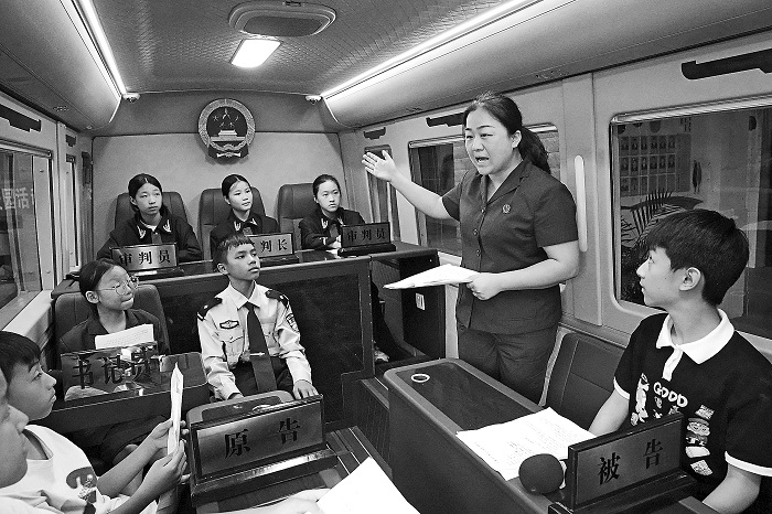 6月24日,在廣西柳州市融水苗族自治縣融水鎮(zhèn)古鼎村小學(xué),模擬法庭正在“審案”。學(xué)生穿上制服化身“審判長”“審判員”“書記員”“法警”等,按照法律程序模擬審理一起“校園欺凌案”,并向全校直播實(shí)況,讓師生在沉浸式體驗(yàn)中了解法律知識、增強(qiáng)法治觀念。