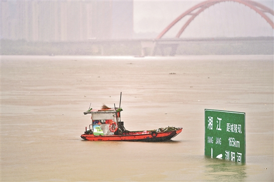 6月26日,工作人員駕駛垃圾清理船從湘江長(zhǎng)沙段一處航標(biāo)指示牌旁經(jīng)過。
