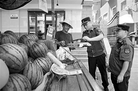 6月26日,在甘肅蘭州市七里河區(qū)西北中學(xué)巷道,城管執(zhí)法隊(duì)員在瓜果攤點(diǎn)巡查。入夏以來(lái),蘭州市在主城區(qū)范圍規(guī)劃設(shè)置360處2293個(gè)應(yīng)季瓜果臨時(shí)攤點(diǎn),蘭州市戶籍的瓜農(nóng)辦理“應(yīng)季自產(chǎn)自銷瓜果臨時(shí)攤點(diǎn)證”后,可在指定點(diǎn)位銷售瓜果。