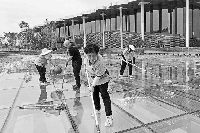 6月27日,在北京市通州區(qū)濱河南路城市綠心森林公園的小圣廟遺址,工作人員正頭頂烈日,擦拭遺址上方新建的玻璃格棧幕墻,迎接即將到來(lái)的暑期客流高峰。據(jù)承建方上海寶冶介紹,北京城市綠心三大公共建筑共享配套設(shè)施主要包括車(chē)庫(kù)、地下商業(yè)餐飲、電影院等,項(xiàng)目已于近日竣工驗(yàn)收,預(yù)計(jì)將在7月初逐步投入使用。本報(bào)記者 吳凡 攝