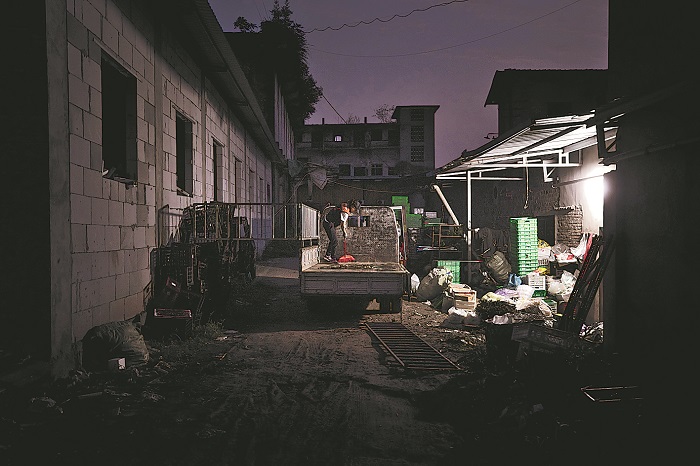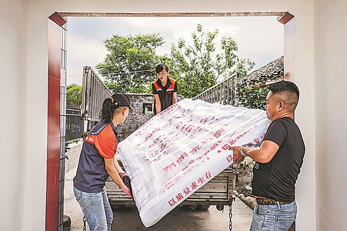 6月2日,在成都郊區(qū)一農(nóng)家院門口,劉希蘭(左一)和聶紅梅在顧客的幫助下卸貨。