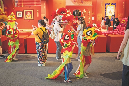 6月29日,北京,中國工藝美術(shù)館內(nèi),小觀眾正在體驗舞獅表演。暑假臨近,不少博物館推出精品展,讓孩子們感受非遺。本報記者 王偉偉 攝