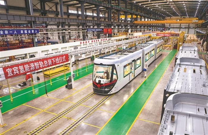 7月1日,在位于四川省宜賓的中車鐵投軌道交通產業(yè)基地生產車間,氫能源智軌電車總裝下線。該氫能源智軌電車由我國自主研制,將于今年8月在宜賓智軌T4線投入使用。新華社發(fā)(莊歌爾 攝)
