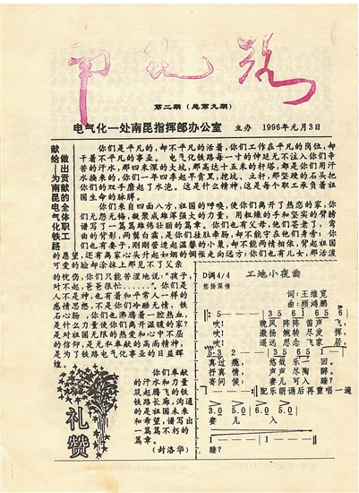 一張名為《南昆路》的16開小報見證了那段歲月。這次劉雪丹重回南昆線之前,“點亮小心愿”活動的組織者特意找出了當年南昆指揮部油印的這份報紙。在1996年3月23日的報紙上,有劉雪丹的詩《妻書》:“離家的路雖有些長,但我不會用柔情將你阻擋。好男兒志在四方,請時刻記住你的背后,總有我關(guān)注的目光……”