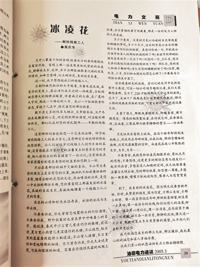 桌上的這摞舊雜志,記錄著許多人的青蔥歲月。在2005年第3期《油田電力通訊》上,有一首散文詩《冰凌花》,其中一段這樣寫道:“不要告訴我,你也曾留戀喧囂街頭的燈紅酒綠;不要告訴我,野外駐扎時也曾在夢中呼喚妻兒的名字……你不曾告訴我,你也無法說清楚,可我卻深深地知道,答案在你飽經(jīng)風霜的雙頰上刻著,在你緊鎖的眉宇間藏著,那是一份對電力工程的火熱赤誠?!?/p>