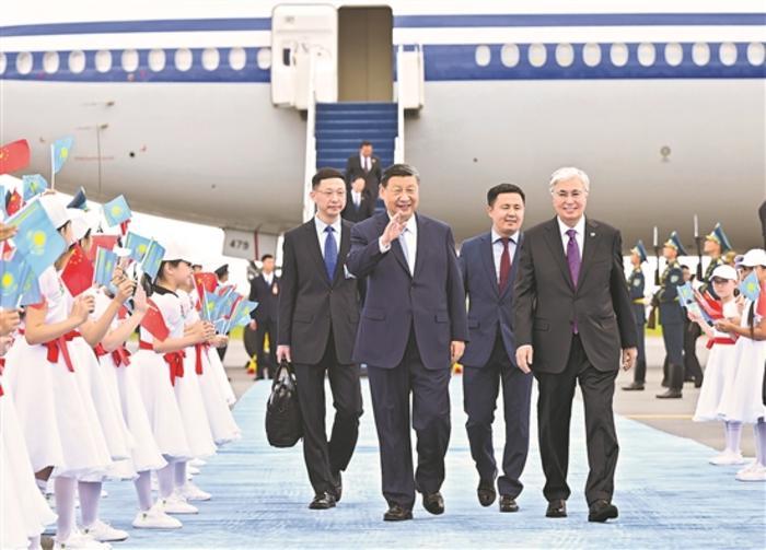 托卡耶夫在機場為習近平舉行盛大隆重的迎賓儀式。100余名儀仗兵英姿挺拔,軍樂團奏響迎賓曲和迎賓號角。近百名哈薩克斯坦兒童揮舞中哈兩國國旗,歡呼“您好”,熱烈歡迎習近平到訪。
