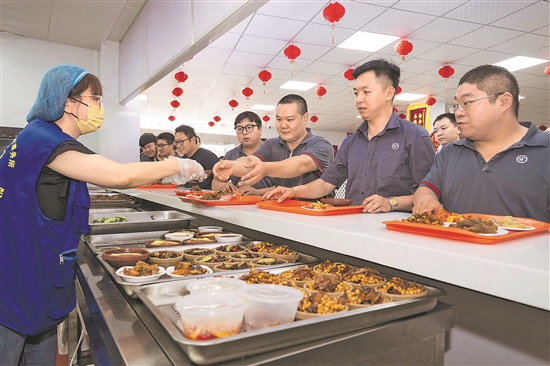 7月2日,在安徽合肥廬陽(yáng)區(qū)海棠街道海棠花園小區(qū)社區(qū)食堂內(nèi),快遞騎手正在就餐。當(dāng)日,海棠街道黨工委、總工會(huì)為轄區(qū)外賣、快遞騎手發(fā)放社區(qū)食堂就餐券、理發(fā)卡等愛心禮包。本報(bào)通訊員 趙明 攝
