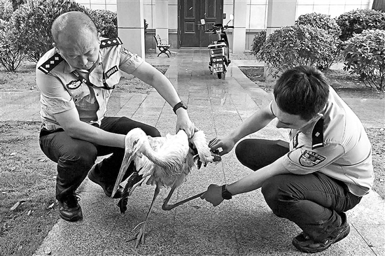 6月29日,江蘇射陽(yáng)縣公安局臨海派出所民警在檢查東方白鸛的受傷情況。當(dāng)日,該所接到村民反映稱有野生鳥(niǎo)類受傷,隨即出警查看。經(jīng)核實(shí),該鳥(niǎo)是國(guó)家一級(jí)重點(diǎn)保護(hù)的野生動(dòng)物東方白鸛。目前,該只東方白鸛已被移交給自然保護(hù)區(qū)進(jìn)行治療。視覺(jué)中國(guó) 供圖