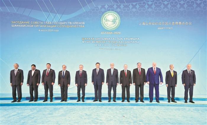 當(dāng)?shù)貢r(shí)間7月4日上午,國家主席習(xí)近平在阿斯塔納獨(dú)立宮出席上海合作組織成員國元首理事會(huì)第二十四次會(huì)議。這是習(xí)近平同上海合作組織成員國領(lǐng)導(dǎo)人集體合影。 新華社記者 鞠鵬 攝
