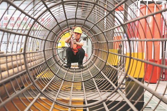 7月2日,在位于廣西百色市凌云縣的一處黃百鐵路鋼筋加工場,工人對焊接部位進行檢查。