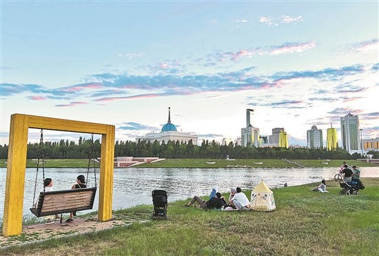 在藍(lán)天白云的映襯下,哈薩克斯坦首都阿斯塔納頗具特色的建筑群勾勒出美麗的天際線。圖為近日,人們在阿斯塔納伊希姆河畔休息。新華社記者 龐興雷 攝