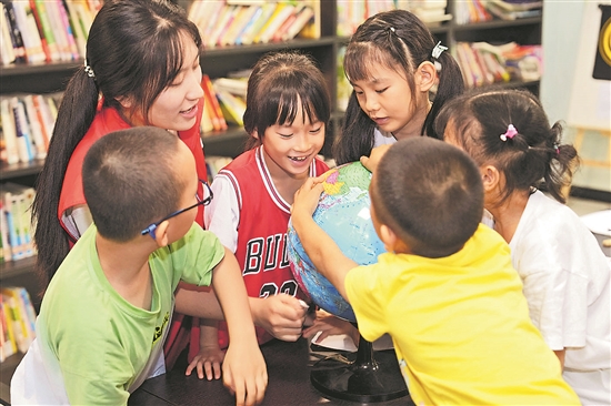 7月4日,在重慶市北碚區(qū)水土街道和悅家園社區(qū),大學(xué)生志愿者在給小朋友介紹地理知識。暑期,水土街道和悅家園社區(qū)、北碚區(qū)和愛社會工作服務(wù)中心聯(lián)合開展為期2個(gè)月的“社區(qū)帶娃驛站”公益服務(wù)活動,招募大學(xué)生志愿者為臨時(shí)輔導(dǎo)教師,為小朋友們提供托管照看服務(wù),與孩子們一起開展文體游戲、手工制作等活動,豐富孩子們的暑假生活。