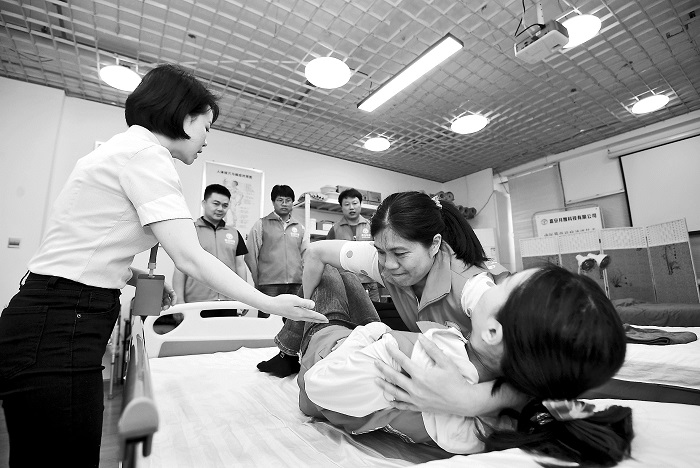7月2日,一名學員正在貴陽市南明區(qū)嘉安月嫂科技有限公司職業(yè)培訓教員的指導下學習家庭護理中的翻身。近年來,當?shù)匾跃蜆I(yè)市場需求為導向,依托轄區(qū)內(nèi)的家政服務(wù)機構(gòu)開設(shè)“家政技能培訓班”,搭建就業(yè)供需平臺,拓寬就業(yè)渠道。本報通訊員 趙松 攝