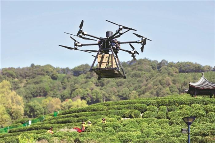圖為3月29日,在浙江省杭州市西湖區(qū)龍井村,順豐無人機飛行在茶園上空運送春茶。本報記者 甘皙 本報通訊員 魏志陽 攝