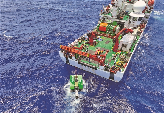 圖為上海交通大學(xué)自主研制的深海重載作業(yè)采礦車工程樣機(jī)“開拓二號(hào)”海試現(xiàn)場(chǎng)。