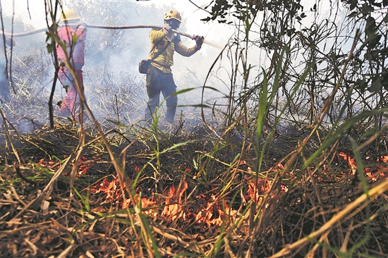 據(jù)巴西觀測機構(gòu)數(shù)據(jù)顯示,世界最大濕地——潘塔納爾濕地今年遭遇連續(xù)火災(zāi),破壞面積創(chuàng)有記錄以來新高。圖為近日,消防員在巴西南馬托格羅索州潘塔納爾濕地參加滅火行動。