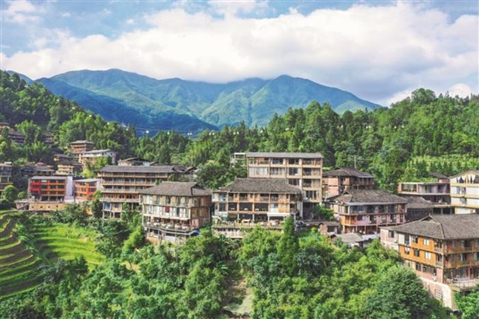 這是在廣西龍勝各族自治縣龍脊鎮(zhèn)大寨村拍攝的民宿和遠(yuǎn)處的觀光索道。