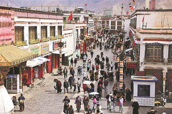 近期,西藏自治區(qū)拉薩市八廓街,游人正在逛街游覽,感受民族風(fēng)情。