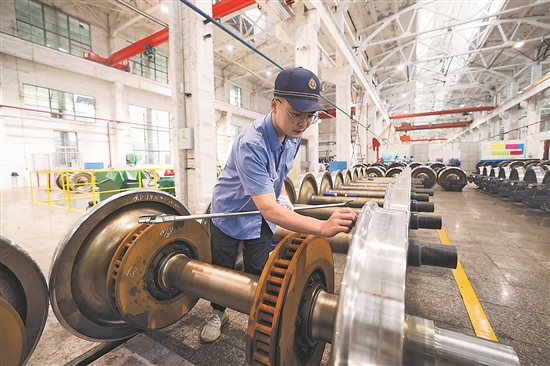 連日來(lái),福建多地出現(xiàn)40℃以上的高溫天氣,為給旅客打造舒適涼爽的旅途環(huán)境,南鐵福州車輛段干部職工頂著高溫做好列車制動(dòng)裝置、空調(diào)裝置、車電裝置等關(guān)鍵設(shè)施設(shè)備的故障檢修工作。圖為車輛鉗工在測(cè)量客車車輛輪對(duì)尺寸。